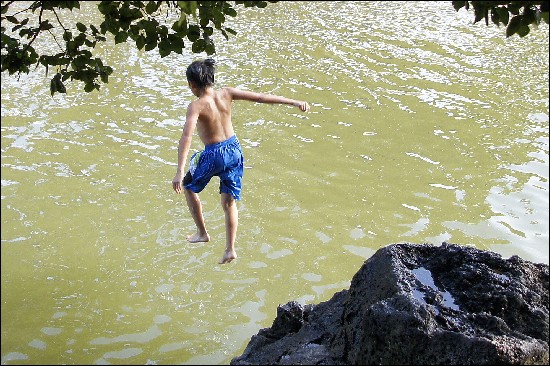 두번째 매력은 민물과 바닷물을 동시에 만날 수 있다는 점이다. 외도천이 흐르는 끝에는 마치 작은 댐처럼 돌을 길게 쌓아 놓은 곳을 만날 수 있다. 평소에는 한라산에서 흐른 물과 용천수가 바다를 향해 흘러가지만 밀물때는 바닷물이 넘쳐 담수와 만나는 장관을 연출한다. 그래서 회귀종인 뱀장어와 은어, 숭어를 흔히 볼 수 있다고 한다.