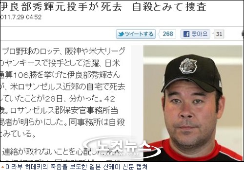 미국의 AP 통신은 29일 "전 뉴욕 양키스의 투수 이라부 히데키가 죽은채로 발견됐다. 자살로 추정된다"고 보도했다. 이라부 히데키는 현지 시간 27일 오후 4시 25분 랜초팔로스버데스의 자택에서 발견됐으며 경찰 당국은 자살이 분명해 보인다고 밝히고 있다.