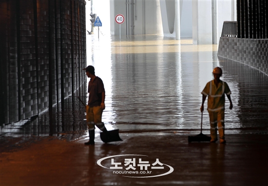 중부지방에 내리던 집중호우가 멈추고 산사태 등으로 피해를 본 지역마다 복구작업이 한창인 가운데 29일 오후 서울 잠수교에서 용산구청 관계자들이 한강 수위가 내려가길 기다리며 다리 진출입로를 청소하고 있다.