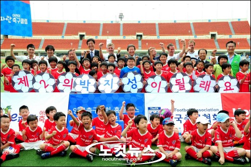 )뒷줄 기준 좌측 첫 번째부터, 강민규 e파란 어린이 축구클럽 선임코치, 이성재 e파란 어린이 축구클럽 수석코치 김영균 한국유소년축구연맹 부회장, 김재한 대한축구협회 부회장 스티븐 프리차드(Steven Pritchard) FA 스킬코치 이승한 홈플러스그룹 회장, 마틴 프레스턴(Martin Preston) FA 유소년 축구프로그램 총괄 매니저 딘 스미스(Dean Smith) FA 스킬코치, 마크 맥클레멘츠(Mark McClements) FA 스킬코치 설도원 홈플러스 부사장{IMG:2}