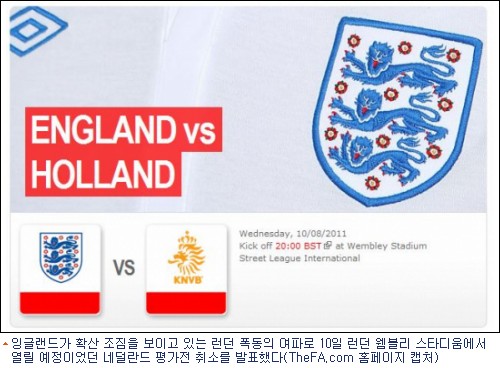 런던에서 발생한 폭동으로 잉글랜드 축구팬들이 손꼽아 기다리던 네덜란드와의 평가전이 결국 취소됐다.
