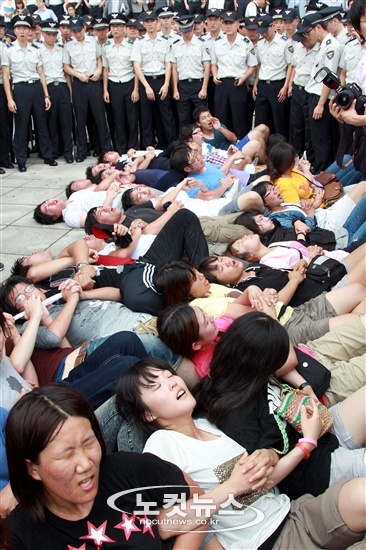한국대학생연합(한대련) 소속 학생들이 12일 오후 국회 본청 앞에서 반값등록금 실현을 촉구하는 기습시위를 벌이고 있다.