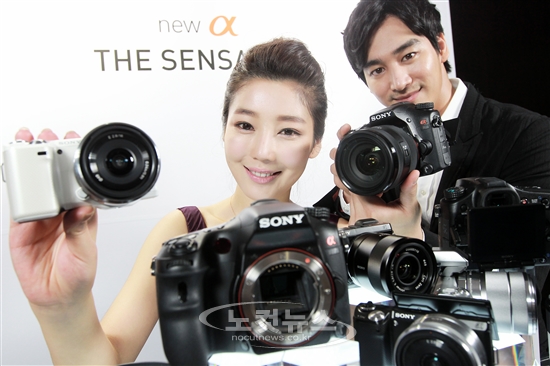 소니코리아(대표 이토키 기미히로)가 25일 서울 중구 장충동 반얀트리 크리스탈 볼룸에서 자사의 2011년 하반기 소니 알파 전략 신제품들을 선보이고 있다. 이번에 공개된 신제품 4종은 세계 최고 수준의 빠른 반응 속도의 NEX-5N, 미러리스 카메라 중 최고 성능의 2,430만 화소 NEX-7, 보급기 중 최고인 2,430만 화소의 알파 65, 초당 12매 연사가 가능한 중급기 알파 77 등이다.