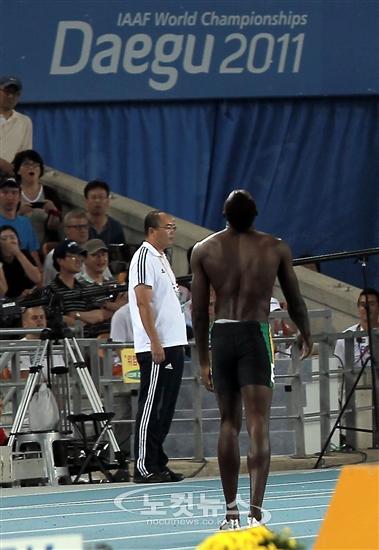 2011 대구세계육상선수권대회 둘째날인 28일 오후 대구광역시 수성구 대흥동 대구스타디움에서 열린 남자 100M 결승에서 부정출발로 실격당한 우사인 볼트가 유니폼 상의를 벗고 안타까워 하고 있다.