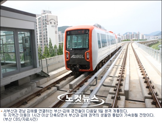 서부산과 경남 김해를 연결하는 부산-김해 경전철이 다음달 9일 본격 개통된다. 두 지역간 이동이 1시간 이상 단축되면서 부산과 김해 권역의 생활권 통합이 가속화될 전망이다.