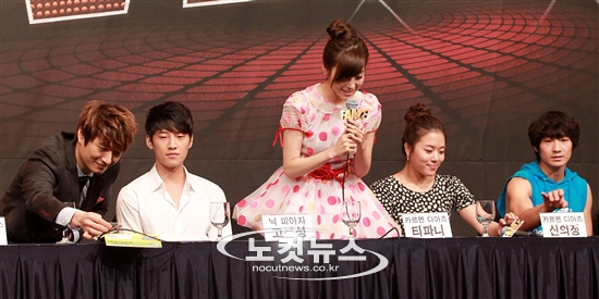 제작발표회에 소녀시대 티파니가 다른 출연자들과 달리 일어서서 인사를 하고 있다.