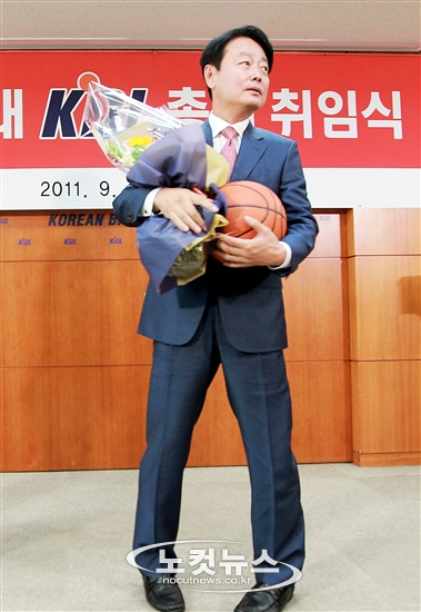 한선교 제7대 한국프로농구연맹(KBL) 신임 총재가 1일 서울 강남구 논현동 KBL센터에서 열린 취임식에서 직원들의 축하 꽃다발과 농구공을 받아들고 있다. 지난 6월 전임 전육 총재와 치열한 경선을 벌인 끝에 한국 프로농구의 새 수장으로 당선된 한 총재는 취임 일성으로 "농구전용체육관 건립 등 인프라 구축과 ''컵대회 신설'' 등을 통해 농구 도약을 이루겠다"고 밝혔다.
