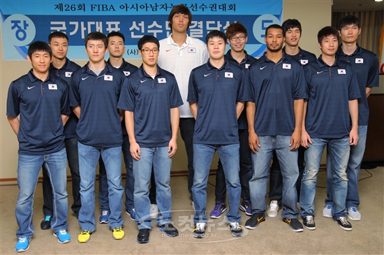 제26회 FIBA 아시아남자농구선수권대회 국가대표팀 결단식이 8일 오전 송파구 방이동 서울올림픽파크텔 KOC 회의실에서 열린 가운데 선수들이 결의를 다지며 기념촬영을 갖고 있다.