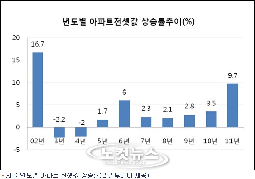 국민은행의 전국주택가격동향조사 결과 올해 1~8월 전국의 아파트 전셋값 상승률은 12.1%로 2002년 이후 9년 만에 최고치를 기록했다.