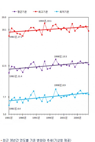 최근 30년 동안 평균기온이 가장 높았던 해는 1998년(13.5℃), 가장 낮았던 해는 1981년(11.4℃)이었다.