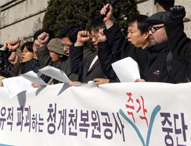 서울시가 위촉한 ''청계천 복원 시민위원회''가 서울시의 청계천 복원 공사 중단을 요구하고 나섰다. 24일 서울시에서 심의를 요청한 복원 실시 설계안을 거부한 시민위원회 간사인 홍성태 교수는 "청계천이 경복궁과 같은 가치를 지닌 역사유적임에도 불구하며, 하나의 하수구로밖에는 취급되지 않는다"고 개탄하고, 서울시의 실시 설계안에는 이러한 인식이 전혀 반영되어 있지 않았다고 비판했다.