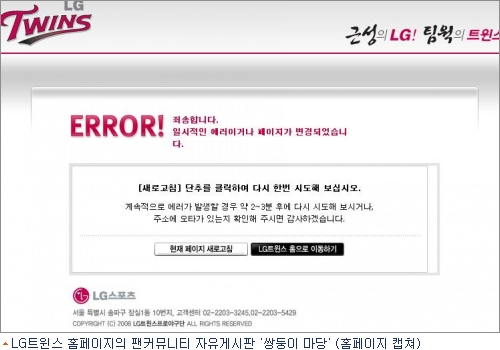 LG트윈스 홈페이지까지 접속이 가능하지만 쌍마에 들어가려고 하면 ''죄송합니다. 일시적인 에러이거나 페이지가 변경되었습니다''라는 에러 메시지만 뜨고 있습니다.