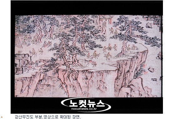 조선시대 화원 이인문이 그린 <강산무진도>(18세기 후반)를 영상확대방식(디지털 인터렉티브)으로 새롭게 접함으로써 그 흥취를 훨씬 실감나게 즐길 수 있었다. 8.5미터에 이르는 두루마리 그림 속에 굽이굽이 이어지는 멋진 산수와 인물풍속,산사,마을 풍경은 그 장대한 규모와 섬세하고 실감나는 묘사에 탄성이 터져나온다.큰 물줄기 쏟아지는 계곡 위 절벽의 편편한 바위 위에서 두 무리의 행락객들이 술판을 벌이고 있다. 깊은 산속까지 인력거를 타고오거나 종자가 끄는 말을 타고 온 것으로 보아 상류층 사람들이 나들이를 나선 것으로 보인다. 그 산중에 여러층의 탑처럼 생긴 날렵한 누각이 보이고, 빼어난 자태의 기와집들이들어서 그 훌륭한 경치에 좋은 기와집들을 짓고 사는 태평성대가 있었나 생각이 든다. 때로는 산중 외딴 길에 개나리 봇짐을 매고 풍류를 즐기는 나그네도 보인다. 중국이 <청명상하도>를 상해 엑스포에서 60미터 영상으로 확대 전시해 입이 떡 벌어지게 했다.북송때 청명절의 풍속을 담아낸 이 그림을 동영상으로 재현함으로써 시장 사람들의 생생한 모습이나 청명절에 연꽃을 띄우는 모습들이 동영상으로 재현되어 실감을 더했다. 메트로폴리탄 박물관에서 중국 왕휘의 20미터에 이르는 산수화를 접하고 그 스케일에 놀란 적이 있다. 이인문의 강산무진도, 장택단의 청명상하도, 왕휘의 거대 산수화는 컴퓨터가 없던 시절, 평면 화면에 그 장대한 산수풍경을 3D입체화면처럼 생생하게 묘사해낸 천재적 능력이 놀라울 뿐이다.
