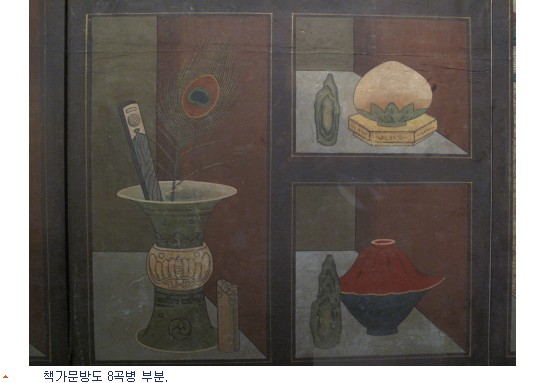 장한종의 <책가문방도 8곡병>(19세기 전반)은 책과 여러 기물이 놓여있는 서가를 그린 것으로 문인들의 수집과 완상 취미를 엿볼 수 있다. 그 안에는 책을 중심으로 도자기,문방구, 과일,꽃 등이 배치되어 있다. 꽃, 두루마리, 석류, 도자기, 새우와 모란을 그린 묵죽도, 장정된 책, 차 주전자, 복숭아 연적, 공작깃털이 꽃힌 화병 등 하나하나 감상하는 재미가 쏠쏠하다.