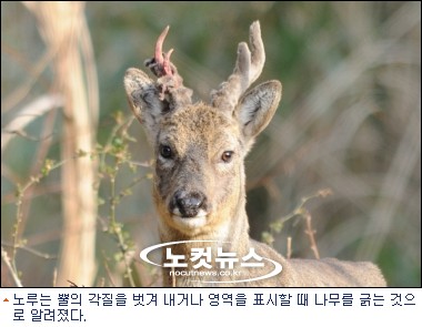 권 박사는 이 과정에서 노루가 나무에 뿔을 마구 긁어 대는 특이한 현상을 발견했다. 주로 뿔이 자라 각질같은 것을 벗겨 내거나 영역을 표시할 때 노루가 자주하는 행동이다.