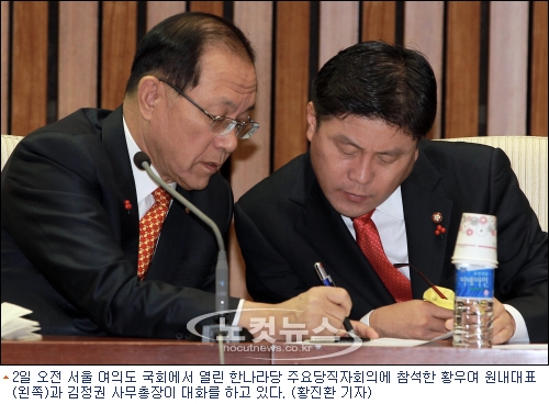 한나라당 황우여 원내대표는 4일 여의도 당사에서 기자간담회를 갖고 "8일 정책 의원총회에서 두가지 입장(소득세 최고구간 신설과 자본이득 과세) 전부를 찬반 토론 거쳐서 의견을 모을 것"이라고 밝혔다.