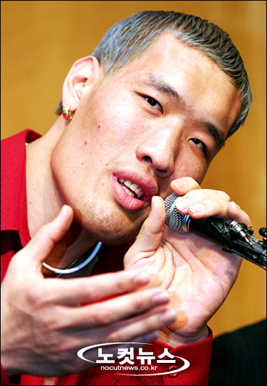 5일 오후 서울 신라호텔에서 열린 ''HEROS 2005 IN SEOUL''과 ''KOREA MAX SERIES''의 한국 공동개최 기자회견에서 K-1의 세계적인 스타로 떠오른 최홍만이 게스트 자격으로 참가해 취재진의 질문에 답변하고 있다.