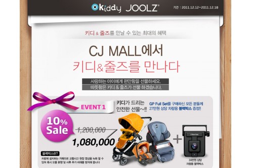 CJ몰 기획전 ''''키디줄즈 브랜드위크''''의 일환으로 실시되는 이번 행사에서는 가디언프로2풀세트 상품을 10%할인된 가격에 제공한다. 아울러 유아용 카시트 단품의 경우 22~23%, 키디유모차는 25~29%, 줄즈유모차는 26%할인 판매하며 키디 보낭커버, 줄즈 캐리컷 등을 사은품으로 증정한다.