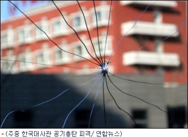 13일 오후 5시쯤(중국 현지시간) 베이징 한국 대사관에 공기총 탄환으로 추정되는 쇠구슬이 날아들어 대사관 내 경제동(棟) 건물의 유리창에 금이 갔다.