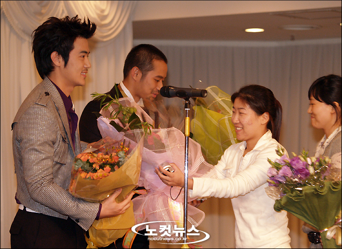 7일 부산국제영화제 중에 열린 제6회 부산 영평상(영화평론가협회상) 시상식에서 남우신인상을 공동 수상한 김강우(왼쪽)와 천정명이 팬들로부터 꽃다발을 받고 있다.