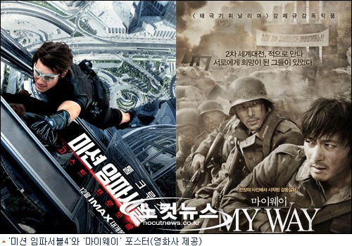 21일 영화예매사이트 맥스무비에서 ''미션 임파서블4''는 27.17%로 예매율 1위를 지켰다. 이날 오전만 해도 ''마이웨이''가 1위로 올라섰지만 오후 3시 기준 다시 순위가 바뀌었다. ''마이웨이''는 26.27%로 ''미션 임파서블4''와 점유율 차가 1% 이내다.