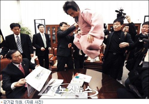 강 의원은 2009년 1월 국회에서 미디어 관련법 처리 반대 농성을 벌이던 민주노동당 당직자들을 국회의장이 질서유지권을 발동해 강제 해산하자, 국회 사무총장실을 찾아가 집기를 쓰러뜨리고 자신을 막는 국회 방호원과 몸싸움을 벌이다 공무집행방해 혐의로 불구속 기소됐다.