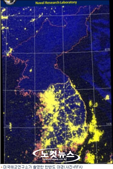 한반도의 야간 사진에서 한국은 수도 서울을 비롯해 전국이 환한 불빛에 둘러싸여 있고, 동해의 고기잡이배조차 불빛을 발하고 있다.