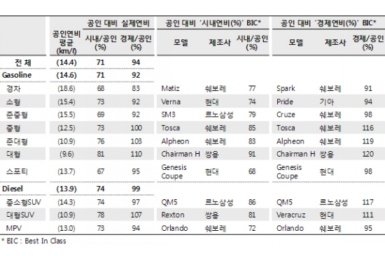 국내 완성차 중에서는 한국지엠의 쉐보레 차량과 쌍용자동차의 실제 체감 연비 효율이 공인 연비에 가장 가까운 것으로 평가됐다. 반면, 현대차와 기아차는 대부분의 제품에서 체감 연비가 공인 연비와는 상당한 차이를 보인 것으로 나타났다.