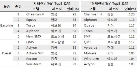 차급을 망라한 전 모델중 쌍용차 체어맨H가 시내연비(91%)와 경제연비(120%)에서 가장 탁월한 성적을 보였다.