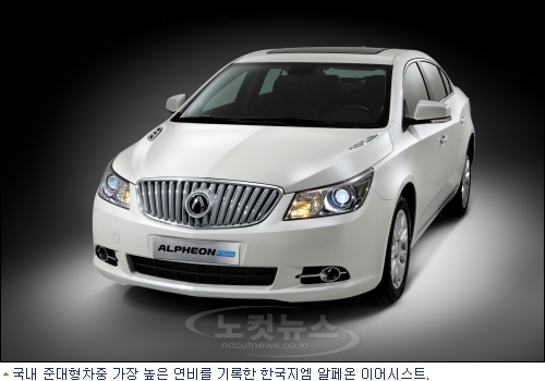 한국지엠의 준대형 승용차 알페온은 공인 연비 대비 시내 주행 시 연비 비율은 83%, 경제적으로 주행했을 시 연비 비율은119%, 중형 승용차 토스카는 시내 연비 85%, 경제 연비 116%, 준중형 크루즈는 시내 연비 70%, 경제 연비 98%, ALV(Active Life Vehicle) 올란도는 시내 연비 72%, 경제 연비 95%, 스파크는 시내 연비 77%, 경제 연비 91%로, 차급별 비교에서 각각 1위를 차지했다.