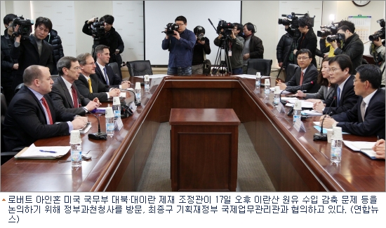 방한한 로버트 아인혼 미국 국무부 대북·대이란 제재 조정관이 17일 외교통상부와 기획재정부, 지식경제부 당국자들을 만나 이란산 원유 수입제한 문제를 논의했다.