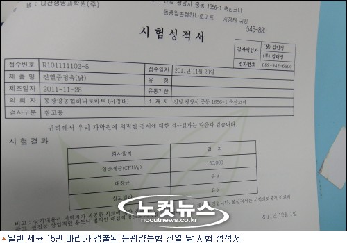 동광양농협이 국가공인 분석기관인 ''다산 생명과학원(주)·광주 광산구 우산동)''에 의뢰한 지난해 11월 ''시험 성적서''에는 축산 코너에 진열 중인 닭의 ''일반 세균''이 g 당 15만 마리로 검출됐다.