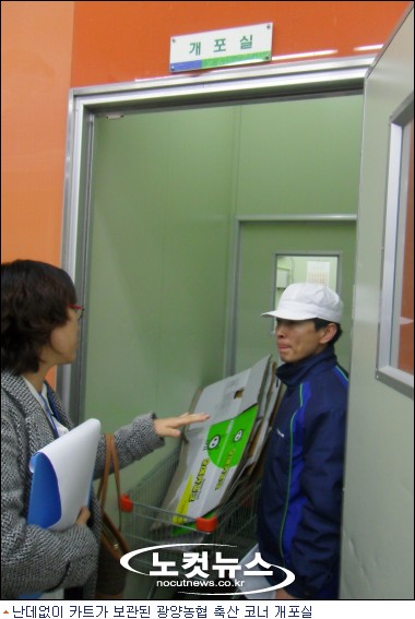 차량에서 운반한 정육 박스를 뜯는 ''개포실''에는 난데없는 카트가 보관돼 있고 온도 또한 실온 상태로 정육을 처리하기에는 부적합했다.