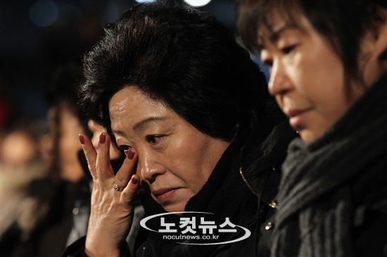 19일 오후 서울광장에서 용산참사 3주기 추모대회가 열리고 있는 가운데 한 유가족이 눈물을 훔치고 있다. 용산 참사는 서울 용산 한강로 남일당 건물에서 점거농성 중인 철거민을 경찰이 진압하는 과정에서 화재가 발생해 5명과 경찰특공대원 1명이 숨진 사건이다.