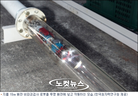대전 대덕연구개발특구 내 한국원자력연구원은 7일 원자력융합기술개발부 김승호 박사팀이 지름 10㎝의 소구경 배관에서 100m까지 자유롭게 이동하면서 1㎜ 이하 이물질이나 파임, 돌출 등 미세 결함을 탐지할 수 있는 비파괴 검사 로봇을 개발했다고 밝혔다.