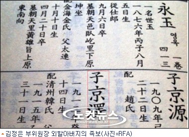 고경택 씨는 지난 1929년 일본으로 건너가 1952년 6월26일 김 부위원장의 생모인 고영희를 낳았으며, 고씨 가족은 1962년 10월21일 제99차 귀환선을 타고 북한으로 간 것으로 확인됐다.