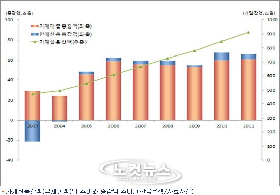 한국은행이 22일 발표한 ''''2011년 4/4분기 중 가계신용'''' 자료를 보면, 2011년 12월 말 현재 우리나라 가계의 부채총액(가계신용 잔액)은 912조8천810억 원인 것으로 나타났다.