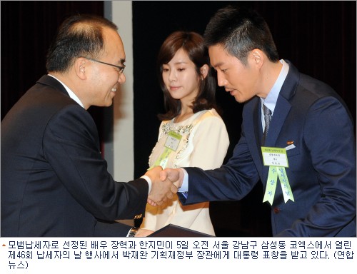 탤런트 장혁 씨와 한지민 씨가 모범납세자로 선정됐다.