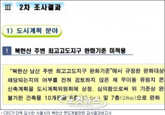CBS가 28일 단독 입수한 서울시의 북한산 콘도개발관련 감사결과에 따르면 서울시 도시계획위원회 (당시 위원장 현 최창식 중구청장)는 2008년 11월 우이동 유원지에 콘도를 신축하는 도시계획시설변경 결정안을 심의의결할 당시 ''최고고도지구 완화기준''을 위배해 콘도 14개동중 10개동에 대해 7층 28m까지 건축할 수 있도록 허가해줬다.