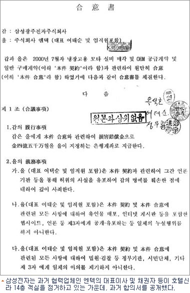 삼성전자가 공개한 합의서는 지난 2004년 12월 24일 삼성광주전자 대리인 옥석호, 엔텍 여태순 대표, 감사 정우홍 등이 직접 작성한 것으로, 처음 납품할 당시인 2000년 7월 냉장고용 모타 설비 매각, OEM 공급 계약과 일반 구매계약과 관련해 원만히 합의했다는 내용을 담고 있다. 삼성광주전자는 2004년 당시 삼성전자의 자회사였으며, 지난해 1월 삼성전자에 흡수합병됐다.
