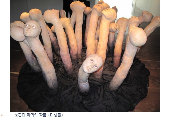 이 작품과 함께 서울시립미술관 전시에 출품된 노 작가의 <미(未)생물> 역시 움직이는 설치작품이다. 이 작품에서 팽이버섯 모양의 단세포인 아메바들은 촉수 끝에 사람의 얼굴을 달고 공허한 눈동자를 굴리며, 관객이 다가서면 고통스러운 듯 몸을 비틀며 서서히 춤을 춘다. 이 작품은 미생물에 불과한 것이 어느 순간 생명력이 부여된, 고통까지 느끼는 인간이 되어 감응을 한다. 작가는 이 작품에 대해 "인간의 형상을 닮은 유기체적인 존재가 꿈틀거리고 있다. 마치 먼 우주 바깥에서 미지의 생물이 규칙적으로 돌고 있는 지구 등의 별들을 확대해서 봤을 때, 인간들이 하루 하루 부대끼며 살고 있는 것을 발견하듯 말이다"라고 설명한다.그는 이어 "인간은 단백질로 구성된 ''단백질 기계''라고 할 수 있다. 인간이 기계로 보이기도 한다"고 했다.