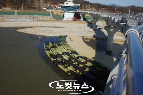 정부쪽 해명도 함께 들어보는 조건이 제시되면서 현장 취재는 속개됐다. 물이 빠진 콘크리트에는 온통 녹조류 투성이었다.