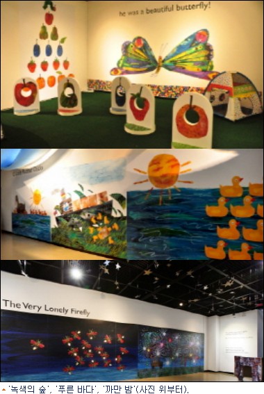 ''푸른 바다''는 전시장 천장에 흩날리는 푸른 천과 조명을 통해 파도의 모습을 연상케 했으며, ''퉁명스러운 무당벌레_''''The Grouchy Ladybug''''에 등장하는 거대한 고래가 벽면을 가득 채우고 있어 마치 바다 속 여행을 하는 듯한 환상적인 느낌을 전한다.
