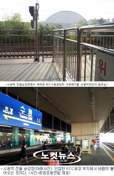 이 단체는 이어 옛 KCC 수원공장은 동쪽으로 수원역이 붙어 있다며 승강장과의 거리가 직선으로 44미터 밖에는 떨어지지 않아 바람으로 인해 수원역 이용자들이 석면에 노출될 우려가 매우 크다고 강조했다.