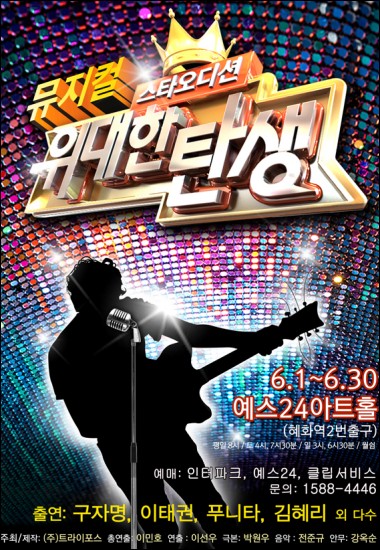 ''위대한 탄생'' 프로그램의 제작진과 출연진이 만드는 뮤지컬 ''위대한 탄생''은 6월1일~30일 대학로 예스24아트홀에서 공연된다.
