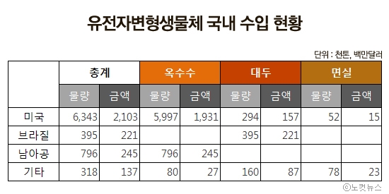 한국바이오안전성정보센터와 식품의약품안전청 자료에 따르면 2011년 국내에 수입된 식용.사료용 유전자변형생물체는 2,872건에 785만톤, 27억 달러 규모다. 수입량만 놓고 보면 전년 대비 8% 감소했지만 총수입액으로는 28% 증가했다. 작물별로는 옥수수와 대두가 대부분을 차지했고 면실류와 캐놀라 등이 소량 수입됐다. 대두의 35%, 옥수수의 87%, 면실의 40%가 미국산 GM 물질이다.