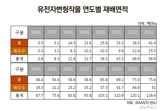 가장 많이 재배되는 GM작물은 콩으로 전체 GM작물의 47%였다. 여기에 더해 GM옥수수(32%), GM면화(15%), GM캐놀라(5%) 등 4대 GM 작물이 전체의 99%를 차지하고 있다. 미국에서 재배되는 대두(콩)의 94%는 GM대두이고, 아르헨티나 대두는 100% GM대두다. 미국 옥수수의 88%는 GM옥수수이고, 면화는 90%가 GM면화다.