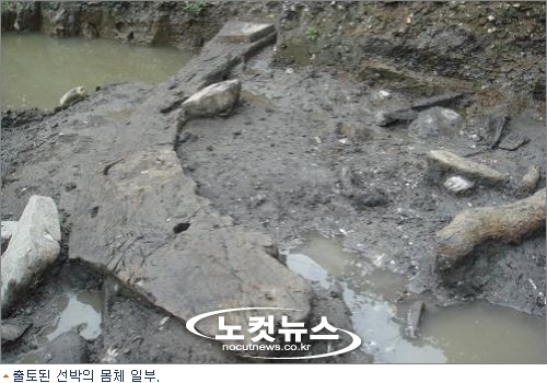 진흙 뻘 속에서 발굴한 길이 3m, 폭 60cm 선박 몸체는 배의 한쪽 격벽으로 추정되고 있다.