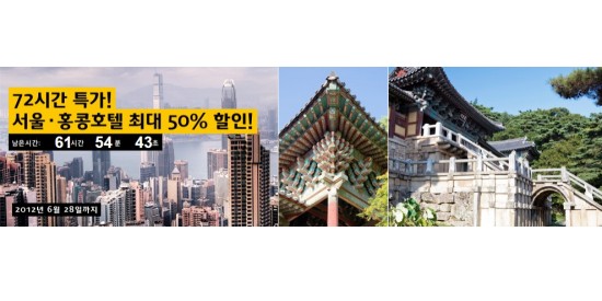 세계최대 온라인 여행사 익스피디아 코리아(www.expedia.co.kr)가 서울 및 홍콩 시내에 위치한 주요 호텔을 단 72시간 동안 최대 50% 할인된 가격에 이용할 수 있는 특가 이벤트를 진행한다.