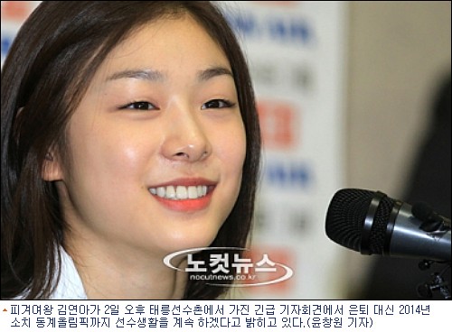 김연아는 2일 태릉선수촌 국제스케이트장에서 긴급 기자회견을 열고 "오는 2014년 소치 동계올림픽까지 선수 생활을 이어간 뒤 은퇴하겠다"고 밝혔다. 이어 "최고의 대한 부담감으로 선수 생활을 포기한다면 나중에 후회와 아쉬움이 밀려올 것 같았다"고 배경을 설명했다.